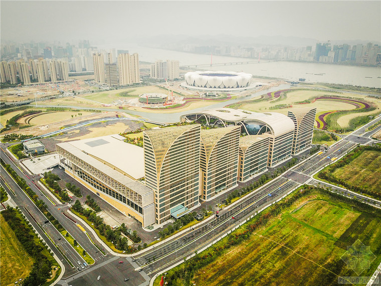 杭州國際博覽中心,位于杭州錢塘江畔,造型大氣而細膩,富于“江南意蘊”,是迄今為止中國乃至世界最大,最先進的超大型城市綜合體。杭州國際博覽中心總占地面積19.7公頃,總建筑面積85萬平方米,主體建筑由地上5層和地下2層組成,集會議、展覽、餐飲、旅游、酒店、商業、寫字樓等多元化業態為一體。內部共有五大核心功能,分別為:會議區、展覽區、辦公區、酒店區、配套服務區以及復雜的交通系統。