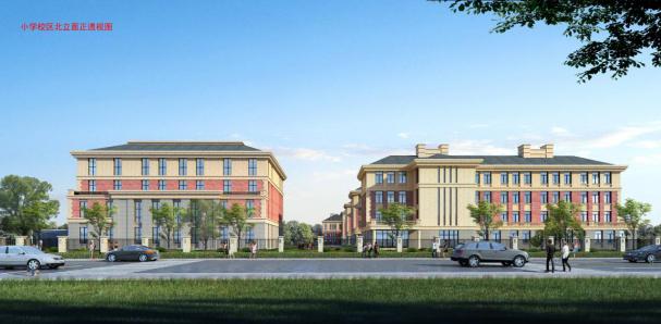 小學總平面布局將學校分為多個部分,教學樓設置于城市主干道一側,其余各部分通過一條連廊進行串聯,這條連廊形成的開放空間使得各功能部分之間聯系更加高效。學校生活區由宿舍樓及食堂構成,置于地塊南側,與教學部分分開,既減少相互干擾,又便于管理。學校入口開放空間明確,并通過雕樓及柱廊形成特色入口空間及入口形象。校園建筑力求樸素簡潔,部分采用白色涂料,明快而素凈。