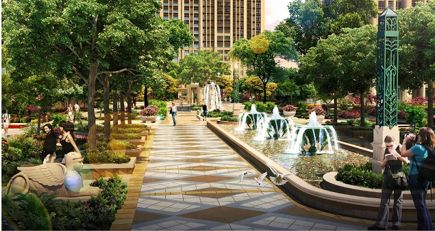 小區內中軸及道路兩旁高大茂密的樹木形成了一片一片相對私密的空間,使整個社區與喧鬧的城市形成鮮明地對比,為業主提供了一個世外桃源般的安靜社區。