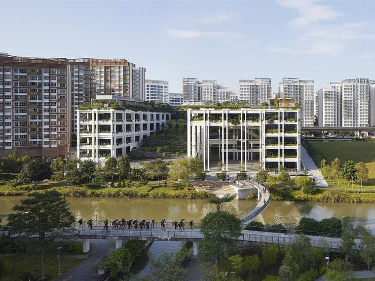 朝向水岸的風(fēng)雨廣場(chǎng)是社區(qū)中充滿活力的核心地帶,可以用于各種類型的社區(qū)活動(dòng)和事件。廣場(chǎng)連接了貫穿場(chǎng)地的東西向和南北向道路,同時(shí)與附近的Oasis輕軌站相連接,從而成為社區(qū)中重要的交通節(jié)點(diǎn)。建筑的每個(gè)立面都充斥著綠植,與環(huán)繞在餐廳和醫(yī)院外部的涼廊共同在室內(nèi)和室外之間形成一層“濾網(wǎng)”,使陽光和自然風(fēng)柔和地透入內(nèi)部空間,從而讓整個(gè)建筑呈現(xiàn)出一種輕盈而開放的感覺。思銳建筑事務(wù)所的主創(chuàng)建筑師Christopher Lee表示:“我們的設(shè)計(jì)借鑒了新加坡住房和發(fā)展委員會(huì)在上世紀(jì)70-80年代開發(fā)的住宅建筑中常見的開放式框架,并基于景觀環(huán)境將這種框架轉(zhuǎn)變?yōu)橐粋€(gè)更加輕盈和開放的、能夠捕捉和容納各類社區(qū)功能的系統(tǒng)——這是一座為社區(qū)生活的展開而打造的建筑。”