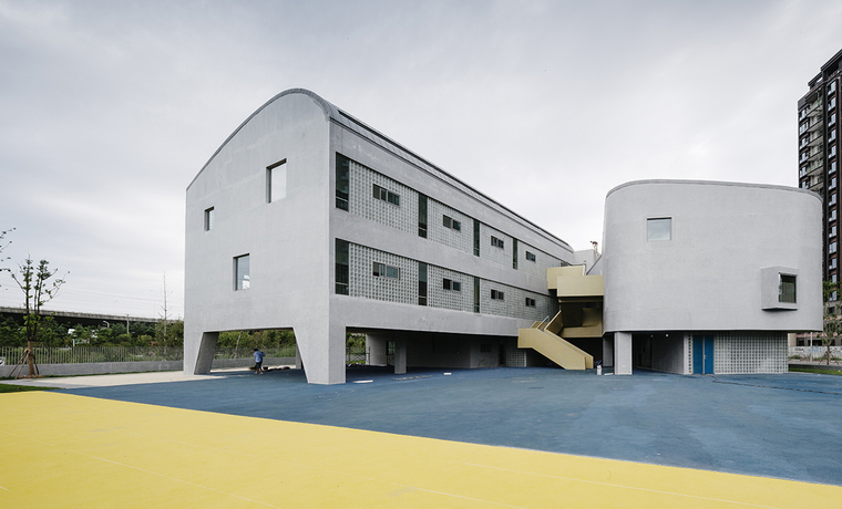 北側的城市界面較為齊整但不失活躍,幼兒園的圍墻沒有完全貼合紅線,而是向內設置了多處轉折,在步行道旁留出了駐足的空間,在入口處后退,留出了家長等候的場地。同時將部分綠地讓出給城市界面共享,以減少對街道的壓迫。圍墻不僅僅是出于安全要求的設計,更是建筑與街道之間的緩沖,在低視角處增加了步行空間的樂趣,形成積極的連續界面。而在高視角的建筑界面,將日常中容易被忽視卻頻繁使用的樓梯間,作為獨立的語匯提取出來,在北側界面穿插進不同顏色和尺度的體量,也讓南側活動室之間的空間更緊湊。盡端以一個多功能廳的弧形輪廓收尾,自然緩和的過渡到室外的活動場地。北側界面在高低有序、材料統一的前提下,調節街道面的節奏感,避免狹窄的場地中連續體量帶來的緊張感。在高層住宅林立的背景前,留給行人和幼兒一個親和的街道面,將幼兒園內部的溫馨環境和適宜尺度,也延續至立面和街道。