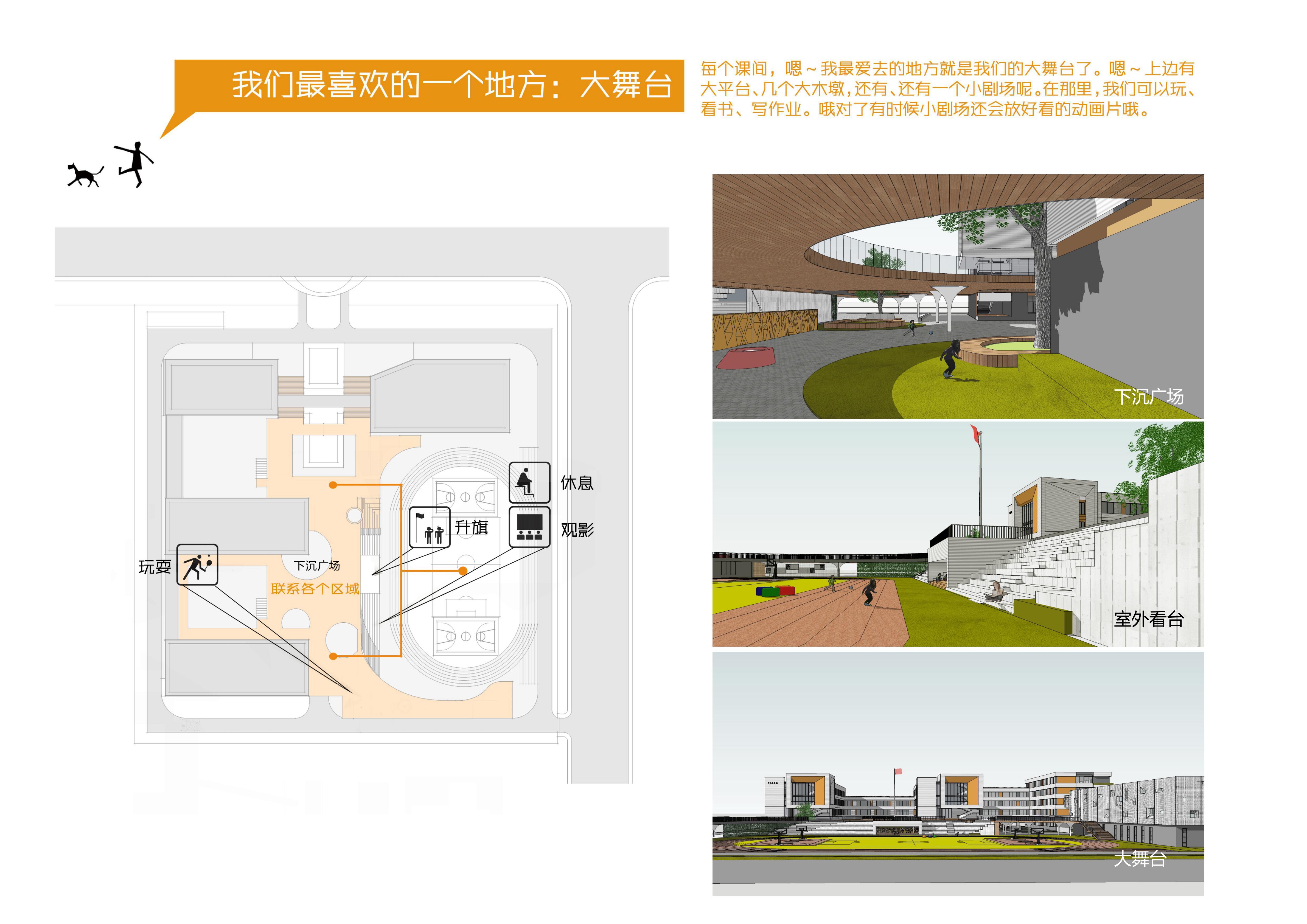 “雙首層”概念是將學(xué)校地上中心部分,局部進(jìn)行一層架空懷抱住操場,架空平臺按照一半面積計算為1100平方,平臺上設(shè)置多個采光井,與景觀設(shè)計融為一體,形成學(xué)生的二層活動空間,與教師增加更多學(xué)習(xí)交流的互動空間,平臺下設(shè)置了功能房間,一個400平圖書閱覽室,2個音樂教室,1個舞蹈教室,一個體育器材室以及公廁。也形成了學(xué)生的一層活動空間,這樣解決了學(xué)生多活動場地少的難題,也解決了舞蹈音樂教室對普通教室教學(xué)引起的噪音污染問題。